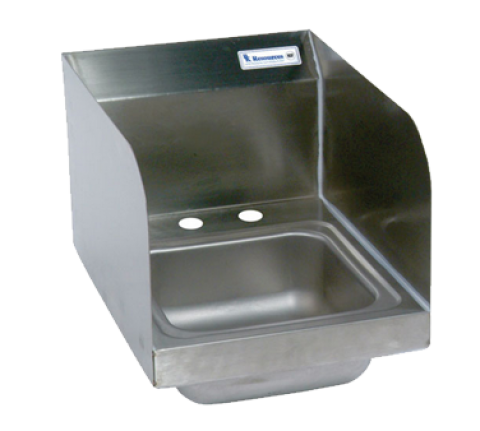 Space Saver Hand Sink, wall mount, 9" wide x 9" front-to-back x 5" deep bowl, 4" OC deck mount faucet holes, marine edge, side splashes on left & right, 7-1/2"H backsplash, includes basket drain & wall mounting hardware, 304 stainless steel construction, NSF