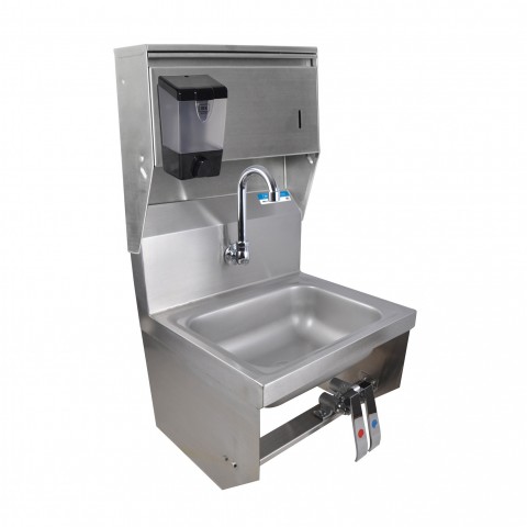 Hand Sink, wall mount, 14" wide x 10" front-to-back x 5" deep bowl, single splash mount faucet hole, includes dual-pedal knee valve kit (BKKSVSGS), 3-1/2" gooseneck spout (BKF-WMB), integral towel dispenser & soap dispenser (BK-SD), 3-1/2" basket drain with crumb cup, wall mounting hardware, 304 stainless steel construction, NSF