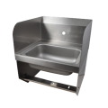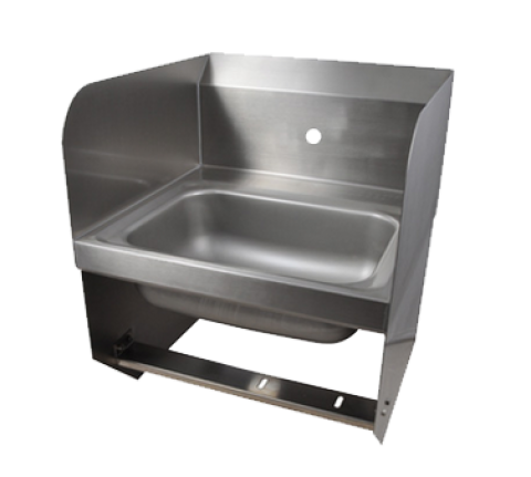 Hand Sink, wall mount, 14" wide x 10" front-to-back x 5" deep bowl, single splash mount faucet hole, side splashes on left & right, 7-3/8"H backsplash, includes: basket drain, knee & wall brackets, 304 stainless steel construction, NSF (does not include knee valve)