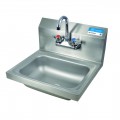 Hand Sink, wall mount, 14" wide x 10" front-to-back x 5" deep bowl, 4" OC splash mount faucet (BKF-W-3G-G, lead free), marine edge, 8-1/8" backsplash, includes 1-7/8" basket drain with crumb cup & wall mounting hardware, 304 stainless steel construction, NSF