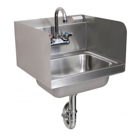 Hand Sink, wall mount, 14" wide x 10" front-to-back x 5" deep bowl, 4" O.C. splash mount faucet holes with (1) BKF-W-3G-G faucet, side splashes on left & right, P-Trap, 1-7/8" drain opening, basket drain & mounting bracket included, 304 stainless steel, NSF