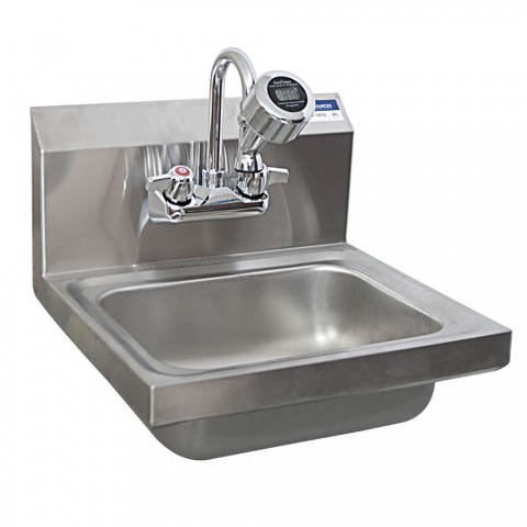 Hand Sink with Sanitimer Handwashing Timer, wall mounted, 14" wide x 10" front-to-back x 5" deep bowl size, splash mounted faucet (BKF-W-3G-G), includes basket drain & wall bracket, 304 stainless steel, NSF