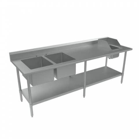 Work Table with prep Sink, sinks on left, 96"W x 30"D, (2) 16" wide x 20" front-to-back x 10" deep sink bowls with 8" O.C. deck mount faucet holes, (1) 14"W x 10"D handsink, with 4" O.C. deck mount faucet holes, 16/304 stainless steel construction, NSF (3-10 Day Lead Time)