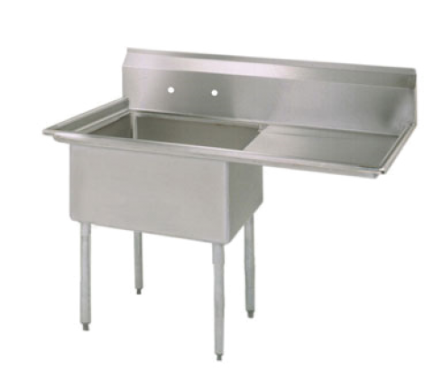 Sink, one compartment, 44-1/2"W x 29-13/16"D x 43-3/4"H overall size, 18" wide x 24" front-to-back x 14" deep compartment, 24" drainboard on right, 9"H backsplash, 8" OC splash mount faucet holes, 1-1/2" rolled edges on front & sides, includes basket drain (BKDR-4), 18/304 stainless steel construction, galvanized steel legs, adjustable high impact corrosion resistant feet, NSF