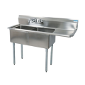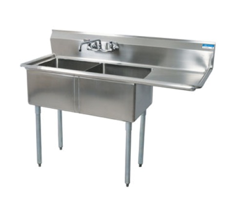 Sink, two compartment, 74-1/2"W x 29-13/16"D x 43-3/4"H overall size, 24” wide x 24” front-to-back x 14" deep compartments, 24" drainboard on right, 9"H backsplash, 8" OC splash mount faucet holes, 1-1/2" rolled edges on front & sides, includes basket drains (BKDR-4), 18/304 stainless steel construction, galvanized steel legs, adjustable high impact corrosion resistant feet, NSF