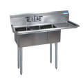 Convenience Store Sink, three compartment, 47-1/2"W x 19-13/16"D x 39-3/4"H overall size, 10" wide x 14" front-to-back x 10" deep compartments, 15" drainboard on right, 9"H backsplash, 8" OC splash mount faucet holes, 1-1/2" rolled edges on front & sides, includes basket drains, 18/304 stainless steel deck & bowl, galvanized steel legs, adjustable high impact corrosion resistant feet, NSF