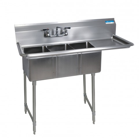 Convenience Store Sink, three compartment, 47-1/2"W x 19-13/16"D x 39-3/4"H overall size, 10" wide x 14" front-to-back x 10" deep compartments, 15" drainboard on right, 9"H backsplash, 8" OC splash mount faucet holes, 1-1/2" rolled edges on front & sides, includes basket drains, 18/304 stainless steel deck & bowl, stainless steel legs & side crossbracing, stainless steel over plastic adjustable bullet feet, NSF