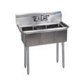 Convenience Store Sink, three compartment, 35-1/2"W x 19-13/16"D x 39-3/4"H overall size, 10" wide x 14" front-to-back x 10" deep compartments, 9"H backsplash, 8" OC splash mount faucet holes, 1-1/2" rolled edges on front & sides, includes basket drains, 18/304 stainless steel deck & bowl, galvanized steel legs, adjustable high impact corrosion resistant feet, NSF
