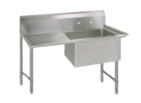 Sink, one compartment, 52-3/16"W x 29-1/2"D x 44-1/16"H overall size, 24” wide x 24” front-to-back x 14” deep compartment, 24" drainboard on left, 10"H backsplash, 8” OC splash mount faucet holes, 1-1/2” rounded front & side edges, includes basket drain, 16/304 stainless steel deck & bowl, stainless steel legs & side bracing, adjustable stainless steel over plastic bullet feet, NSF