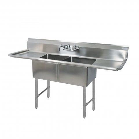 Sink, two compartment, 99-1/4"W x 29-1/2"D x 44-1/16"H overall size, 24” wide x 24” front-to-back x 14” deep compartments, (2) left & right 24" drainboards, 10"H backsplash, 8” OC splash mount faucet holes, 1-1/2” rounded front & side edges, includes basket drains, 16/304 stainless steel deck & bowls, stainless steel legs & end bracing, adjustable stainless steel over plastic bullet feet, NSF