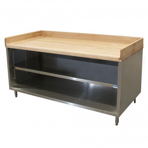 Chef Table, cabinet base with open front, 72"W x 30"D x 39"H overall size, 1-3/4" thick hard maple bakers top with 4" coved riser on back and sides, 18/304 stainless steel body, enclosed with stainless steel panels on sides and rear, 6” stainless steel legs with 1" height adjustment, stainless steel feet, NSF