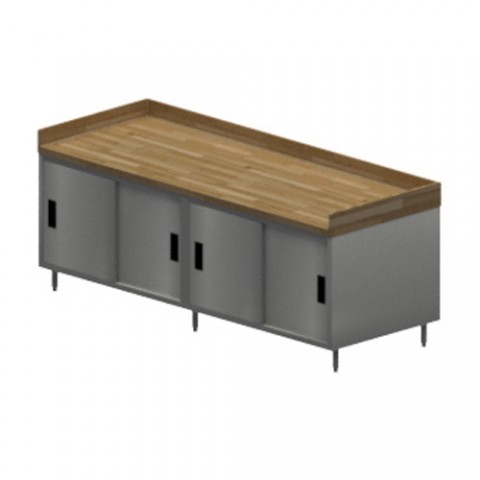 Chef Table, cabinet base with sliding doors, 96"W x 30"D x 39"H overall size, 1-3/4" thick hard maple bakers top with 4" coved riser on back and sides, 18/304 stainless steel body, center mullion, (2) sets of sliding doors, 6” stainless steel legs with 1" height adjustment, stainless steel feet, NSF (3-10 day lead time)