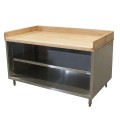 Chef Table, cabinet base with open front, 48"W x 36"D x 39"H overall size, 1-3/4" thick Hard Maple Bakers Top with 4" coved riser on back and sides, 18/304 stainless steel body, enclosed with stainless steel panels on sides and rear, 6” stainless steel legs with 1" height adjustment, stainless steel feet, NSF