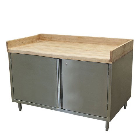 Chef Table, cabinet base with hinged doors & lock, 60"W x 36"D x 39"H overall size, 1-3/4" thick Hard Maple Bakers Top with 4" coved riser on back and sides, 18/304 stainless steel body, (1) set hinged doors with lock, enclosed with stainless steel panels on sides and rear, 6” stainless steel legs with 1" height adjustment, stainless steel feet, NSF (3-10 day lead time)