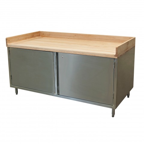Chef Table, cabinet base with hinged doors & lock, 72"W x 36"D x 39"H overall size, 1-3/4" thick Hard Maple Bakers Top with 4" coved riser on back and sides, 18/304 stainless steel body, (1) set of hinged doors with lock, enclosed with stainless steel panels on sides and rear, 6” stainless steel legs with 1" height adjustment, stainless steel feet, NSF (3-10 day lead time)