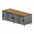 Chef Table, cabinet base with sliding doors, 96"W x 30"D x 34-3/4"H overall size, 1-3/4" thick hard maple flat top with penetrating oil finish, 18/304 stainless steel body, center mullion, (2) sets of sliding doors, 6” stainless steel legs with 1" height adjustment, stainless steel feet, NSF (3-10 day lead time)