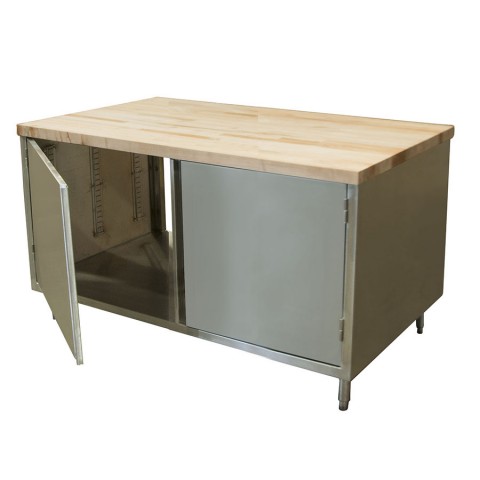 Dual Access Chef Table, cabinet base with hinged doors on both sides, 48"W x 36"D x 34-3/4"H overall size, 1-3/4" thick hard maple flat top with penetrating oil finish, 18/304 stainless steel body, (1) set of hinged doors on each side, 6” stainless steel legs with 1" height adjustment, stainless steel feet, NSF (3-10 day lead time)