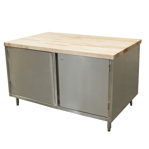 Chef Table, cabinet base with hinged doors & lock, 60"W x 36"D x 34-3/4"H overall size, 1-3/4" thick hard maple flat top with penetrating oil finish, 18/304 stainless steel body, (1) set of hinged doors with lock, 6” stainless steel legs with 1" height adjustment, stainless steel feet, NSF (3-10 day lead time)