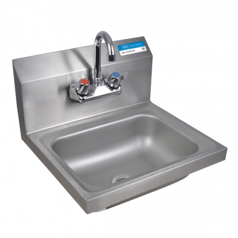 Premier Case Pack with Free Shipping of (4) BKHS-W-1410-P-G Hand Sinks, wall mount, 14" wide x 10" front-to-back x 5" deep bowl, 4" OC splash mount faucet (BKF-W-3G-G, lead free), marine edge, 8-1/8" backsplash, includes 1-7/8" basket drain with crumb cup & wall mounting hardware, 304 stainless steel construction, NSF
