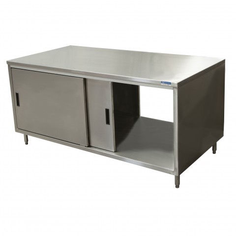 Dual Access Chef Table, cabinet base with sliding doors on both sides, 72"W x 24"D x 34-3/4"H, 14/304 stainless steel top, 18/304 stainless steel body, (1) set of doors on each side, 6” stainless steel legs with 1" height adjustment, stainless steel feet, NSF (3-10 day lead time)