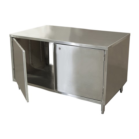 Dual Access Chef Table, cabinet base with hinged doors & locks on both sides, 60"W x 36"D x 34-3/4"H overall size, 14/304 stainless steel top, 18/304 stainless steel body, (1) set of doors with locks on each side, 6” stainless steel legs with 1" height adjustment, stainless steel feet, NSF (3-10 day lead time)