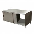 Dual Access Chef Table, cabinet base with sliding doors on both sides, 72"W x 36"D x 34-3/4"H overall size, 14/304 stainless steel top, 18/304 stainless steel body, (1) set of doors on each side, 6” stainless steel legs with 1" height adjustment, stainless steel feet, NSF (3-10 day lead time)