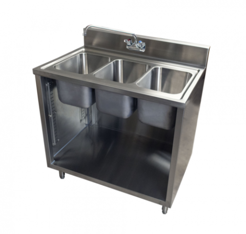 Sink Cabinet, (3) compartment, overall dimensions 36"W x 24"D x 39-3/4"H, 18/304 stainless steel, 34-3/4" working height, accepts 4" OC faucets, includes BKF-W2-12-G 12" swing spout faucet, (3) BKDR-4, NSF, 5-7 business days lead time
