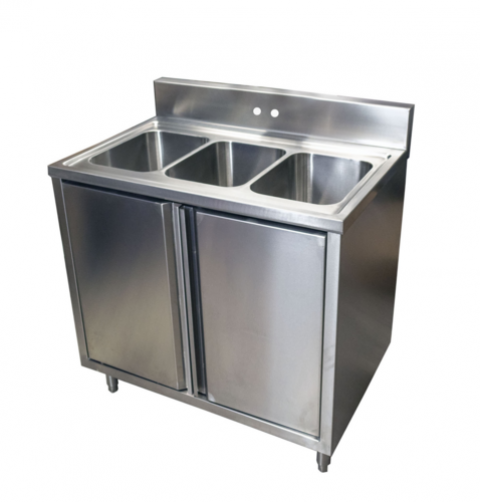 Sink Cabinet, (3) compartment, overall dimensions 36"W x 24"D x 39-3/4"H, 18/304 stainless steel, 34-3/4" working height, accepts 4" OC faucets, hinged doors, NSF, 5-7 business days lead time