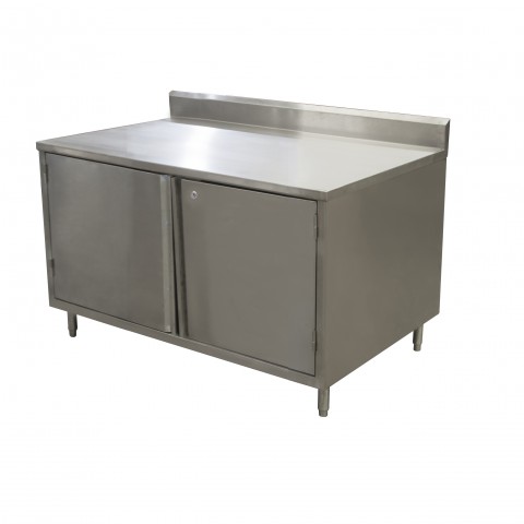 Work Table, cabinet base with hinged doors & locks, 36"W x 30"D x 39-3/4"H overall size, 14/304 stainless steel top with 5" back riser, 18/304 stainless steel body, (1) set of hinged doors with lock, 6" stainless steel adjustable legs, NSF (3-10 day lead time)