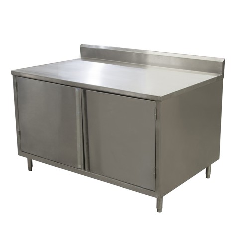 Work Table, cabinet base with hinged doors, 48"W x 36"D x 39-3/4"H overall size, 14/304 stainless steel top with 5" back riser, 18/304 stainless steel body, (1) set of hinged doors, 6" stainless steel adjustable legs, NSF (3-10 day lead time)
