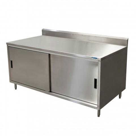 Chef Table, cabinet base with sliding doors, 72"W x 36"D x 39-3/4"H overall size, 14/304 stainless steel top with 5" back riser, 18/304 stainless steel body, (1) set of doors, 6” stainless steel legs with 1" height adjustment, stainless steel feet, NSF (3-10 day lead time)