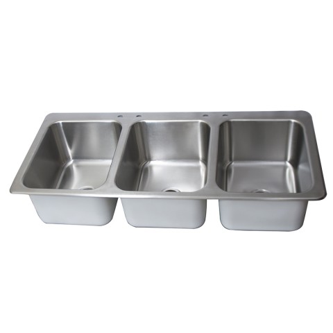 Drop-In Sink, three compartment, 55-3/4"W x 25"D x 12"H overall size, (3) 16" wide x 20" front-to-back x 12" deep compartments, (2) sets of 4" OC deck mount faucet holes, includes (3) basket drains (BKDR-4), 18/304 stainless steel construction, NSF