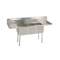 Economy Sink, three compartment, 60"W x 19-13/16"D x 43-3/4"H overall size, 10" wide x 14" front-to-back x 10" deep compartments, (2) left & right 15" drainboards, 9”H backsplash, 1-1/2” rounded front & side edges, 8” OC splash mount faucet holes, drains included, 18 gauge stainless steel deck & bowls, galvanized legs, adjustable high impact corrosion resistant feet, NSF (NET)