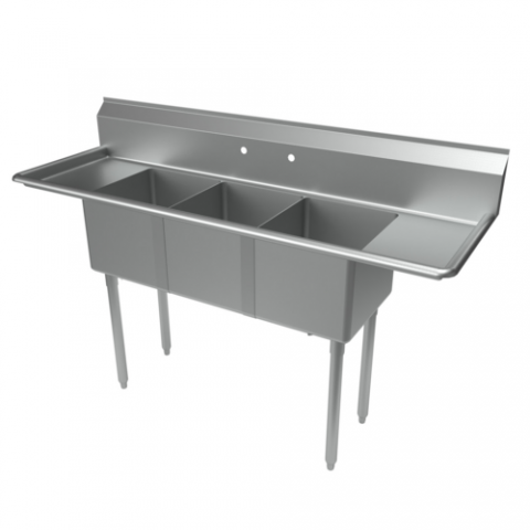 Economy Sink, three compartment, 66" x 21-13/16" overall size, 14" wide x 16" front-to-back x 12" deep compartments, 9"H backsplash, (2) 12" drainboards, 1/2" rounded front & side edges, 8" OC splash mount faucet holes, (3) (BKDR-4) 3-1/2" drains Included, 18 gauge stainless steel deck & bowls, galvanized legs, adjustable high impact corrosion resistant feet (NET)