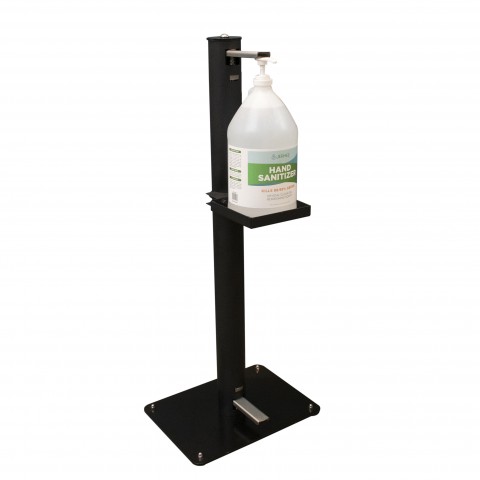 Foot Operated Sanitizer Stand, holds up to a 1-gallon hand sanitizer jug, foot activated pedal dispenses sanitizer, hands free operation, powder coated steel assembly, stainless steel pedals,