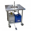 Handwash Sink, mobile, cold water only, 12" x 10" x 5-3/4" bowl, valveless 5" deck mount gooseneck spout, pump saving foot switch, 5 gallon fresh water tank, 7 gallon waste water tank, top fill soap dispenser, 18 gauge stainless steel top, galvanized legs and undershelf, 5" casters with toe lock brakes, 115v, GFCI power cord and plug, UL