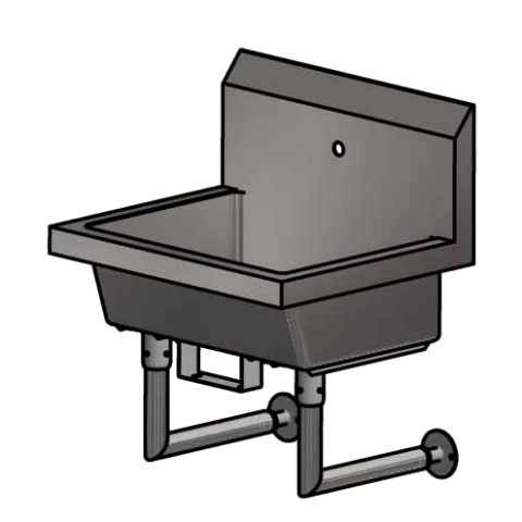 Single Station Handwash Sink, wall mounted, single hole splash mount faucet hole, 24"W x 19-7/8" front-to-back x 8" deep bowl, knee valve bracket, 14/304 stainless steel sink, basket drain, 18 gauge stainless steel legs & supports, NSF (3-5 day lead time)