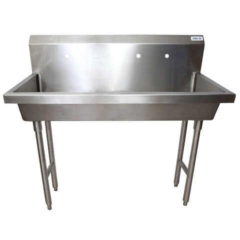 Two Station Handwash Sink, freestanding, (2) sets of 8" OC splash mount faucet holes, 48"W x 19-7/8" front-to-back x 8" deep bowl, 14/304 stainless steel sink, basket drain, 18 gauge stainless steel legs & supports, NSF (3-5 day lead time)