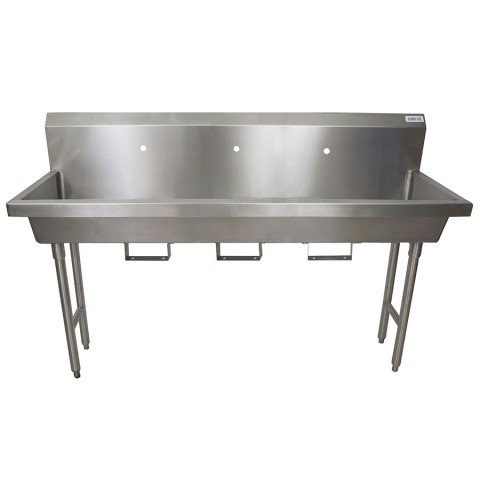 Three Station Handwash Sink, freestanding, (3) single hole splash mount faucet holes, 72"W x 19-7/8" front-to-back x 8" deep bowl, knee valve bracket, 14/304 stainless steel sink, basket drain, 18 gauge stainless steel legs & supports, NSF (3-5 day lead time)