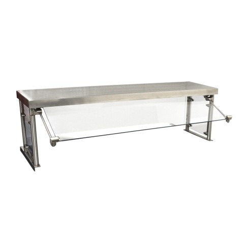 Multi-Use Adjustable Sneeze Guard with Shelf, fits BK Resources 3-well steam tables, full or self-service, 12" deep top shelf, 1/4" tempered glass panels, 18 gauge stainless steel construction, fully adjustable front glass panel, quick release button allows for 10° angled adjustment, (ships KD)