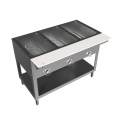Steam Table, electric, 3-pan open well design, 20-gauge stainless steel construction, open base with shelf, die-stamped openings, infinite temperature control, independently controlled wells with indicator lights, removable poly cutting board with stainless steel support shelf, galvanized liner, undershelf for storage, sneeze guards, overshelves, and extra parts available at an additional cost, 500W per well, NSF, cULus