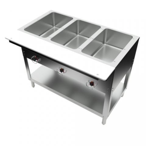 Steam Table, electric, 3-pan open well design, 20-gauge stainless steel construction, partially enclosed base with shelf, die-stamped openings, infinite temperature control, independently controlled wells with indicator lights, removable poly cutting board with stainless steel support shelf, sealed compartments, sneeze guards, overshelves, and extra parts available at an additional cost, 750W per well, NSF, cULus