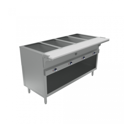 Steam Table, electric, 58-3/8"W x 30-1/2"D x 34"H, (4) open pan wells (water pan sold separately), cutting board shelf, undershelf for storage, galvanized lined heat compartments, insulated, infinite temperate control, partially enclosed base, 20 gauge stainless steel construction, 500 watts per well, 120v/60/1-ph, NEMA 5-15P