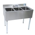 Slim-Line Underbar Sink, three compartment, 36”W x 18-1/4"D x 32-1/2"H overall size, 10" wide x 14" front-to-back x 10" deep compartments, 4-1/2"H backsplash, 4" OC splash mount lead-free faucet (BKF-W2-10-G), stainless steel apron on front & sides, includes basket drains (BKDR-2) & removable overflow standpipes (BK-OT-15075), 18/304 stainless steel construction, stainless steel legs & adjustable side bracing, adjustable high impact corrosion resistant feet, NSF