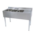 Slim-Line Underbar Sink, three compartment, 48”W x 18-1/4"D x 32-1/2"H overall size, 10" wide x 14" front-to-back x 10" deep compartments, 13-5/8” stamped drainboard on right, 4-1/2"H backsplash, 4" OC splash mount lead-free faucet (BKF-W2-10-G), stainless steel apron on front & sides, includes basket drains (BKDR-2) & removable overflow standpipes (BK-OT-15075), 18/304 stainless steel construction, stainless steel legs & adjustable side bracing, adjustable high impact corrosion resistant feet, NSF
