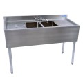 Underbar Sink, two compartment, 48”W x 21-1/4"D x 32-1/2"H overall size, 10" wide x 14" front-to-back x 10" deep compartments, (2) left & right 13-3/16" stamped drainboards, 4-1/2"H backsplash, 4" OC deck mount lead-free faucet (BKD-10-G), stainless steel apron on front & sides, includes basket drains (BKDR-2) & removable overflow standpipes (BK-OT-15075), 18/304 stainless steel construction, stainless steel legs & adjustable side bracing, adjustable high impact corrosion resistant feet, NSF