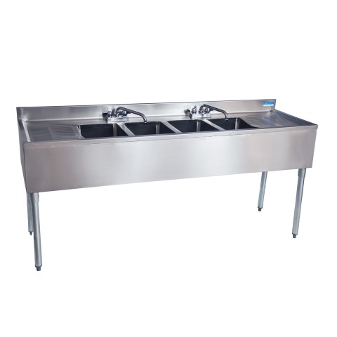 Underbar Sink, four compartment, 72”W x 21-1/4"D x 32-1/2"H overall size, 10" wide x 14" front-to-back x 10" deep compartments, (2) left & right 13-3/4" stamped drainboards, 4-1/2"H backsplash, (2) 4" OC deck mount lead-free faucets (BKD-10-G), stainless steel apron on front & sides, includes basket drains (BKDR-2) & removable overflow standpipes (BK-OT-15075), 18/304 stainless steel construction, stainless steel legs & adjustable side bracing, adjustable high impact corrosion resistant feet, NSF