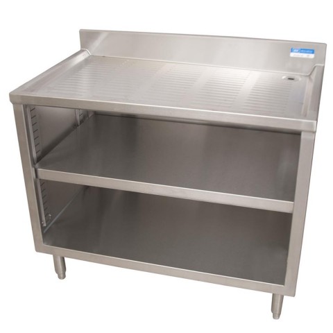 Underbar Glass Rack Unit, drainboard top, 48"W x 21"D x 32-1/2"H, open front base, adjustable shelf, 18/304 stainless steel top with 3" backsplash, & 1" NPS drain (BKDR-15CP), stainless steel legs, adjustable high impact corrosion resistant feet, NSF
