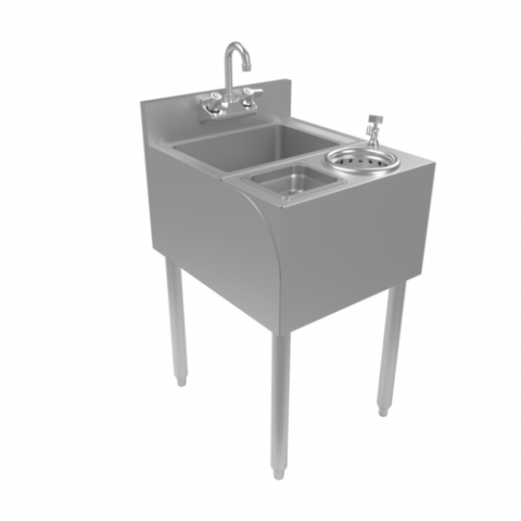 Speed Station With Dump Sink, 18"W x 21-1/4"D, 14" wide x 10" front-to-back x 6" deep sink bowl with 1-1/2" drain, 4" O.C. splash mount faucet holes, stainless steel legs, adjustable plastic bullet feet, 18 gauge stainless steel construction