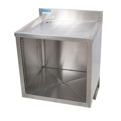 Underbar Glass Rack Unit, drainboard top, 24"W x 21"D x 33-1/2"H, open front base, 18/304 stainless steel top with 3" backsplash & 1" NPS drain (BKDR-15CP), pedestal base, NSF